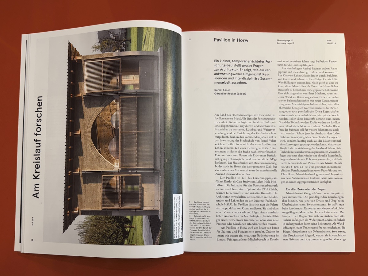 Textbeitrag für die Fachzeitschrift «werk, bauen+wohnen» 12-2025, über einen Pavillon in Horw mit kreislauffähiger Konzeption, von OXARA zusammen mit Studierenden und Dozierenden der HSLU.